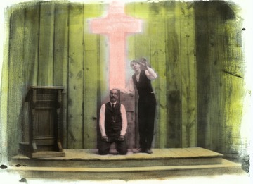 These images were made with liquid photographic emulsion and oil paint, using the original anamorphic camera negatives from the film "There Will Be Blood" (original cinematography by Robert Elswit)